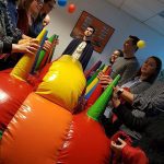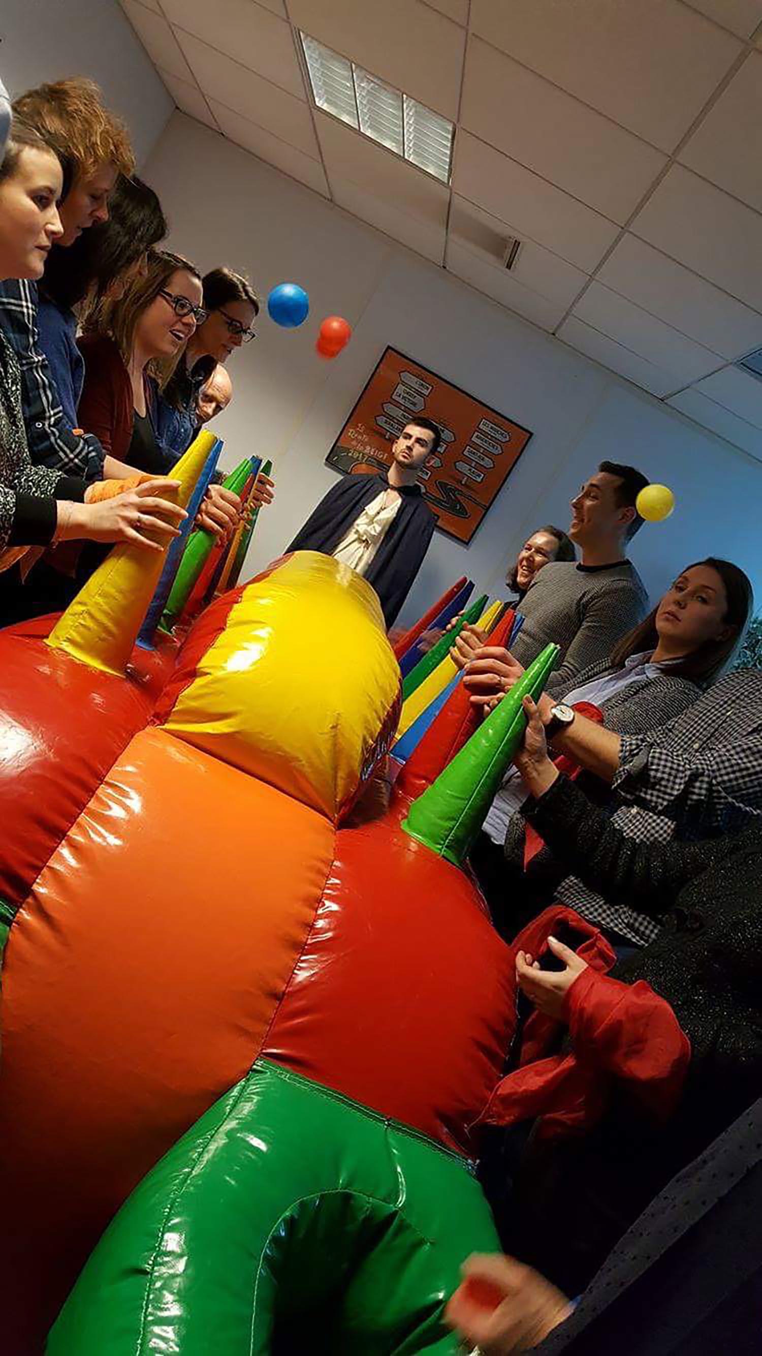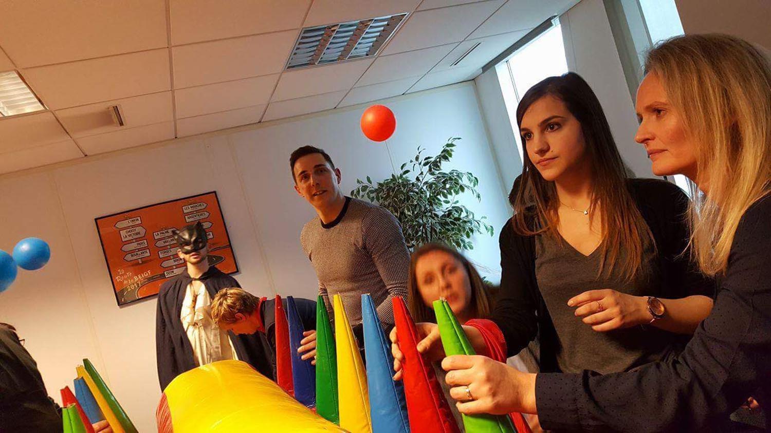 Voici la règle de ce nouveau jeu gonflable : chaque joueur dispose de 5 balles à faire passer d’un panier à l’autre, sans les faire tomber, en les faisant passer de cône en cône. Ce jeu gonflable est vraiment surprenant et il devient un super jeu de compétition pas si évident que ça.