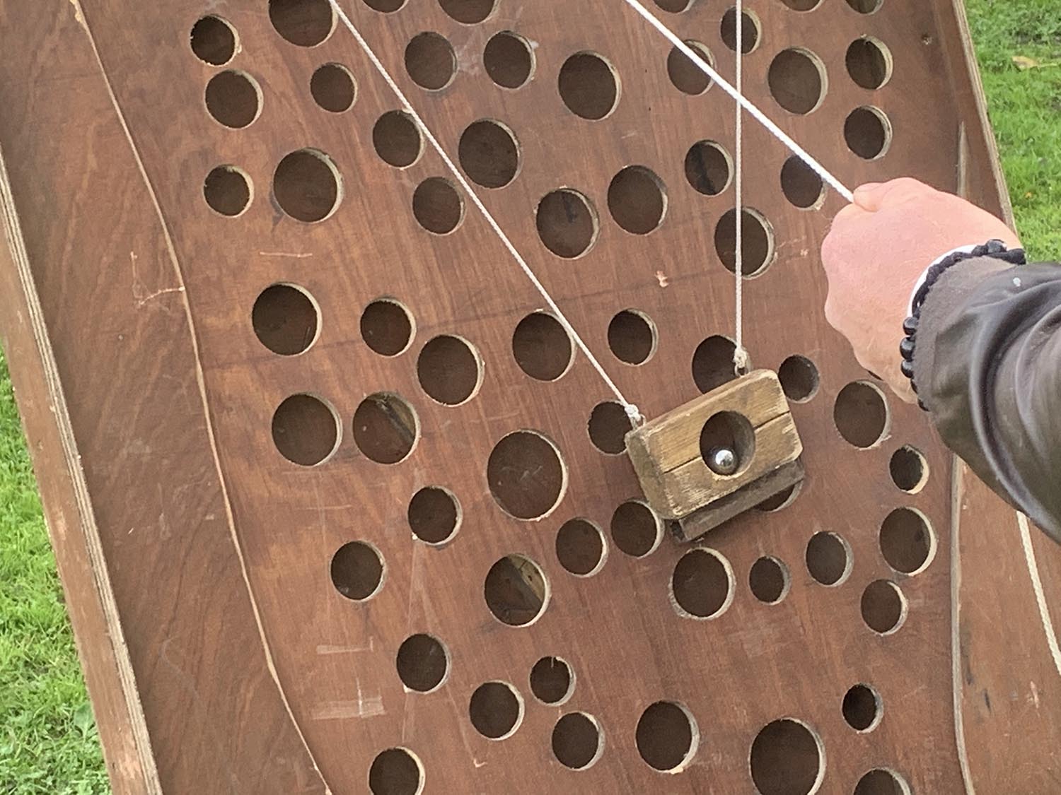 Les joueurs doivent, à tour de rôle, en tirant sur les cordages, faire monter la bille d’acier le plus haut possible. Dès que la bille tombe dans un trou, elle arrive tout en bas dans le trou à points correspondant.